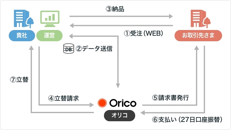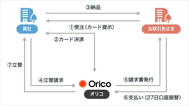 お取引先さまに対して、提携のB2B決済カードを発行し、お取引先さまに代わってオリコが仕入代金を一括立替払いいたします。